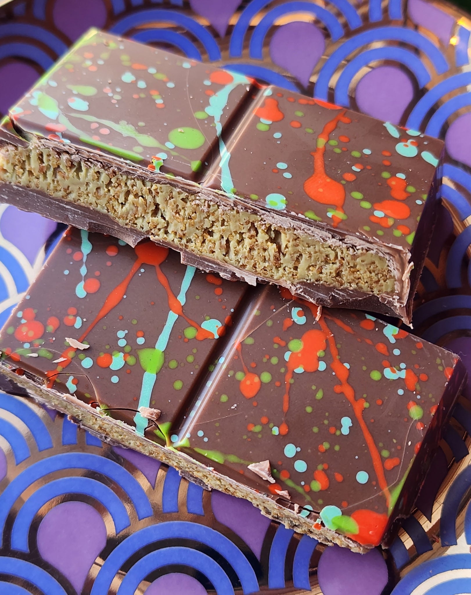 Our Popular Milk Chocolate Dubai Bar But half the size! Milk Chocolate shell filled with Pistachio Cream and crispy Katiafi browned up in brown butter.